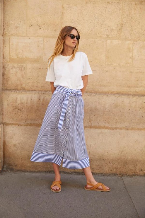 La jupe Love rayures bleu et blanc possède une large ceinture plate et élastiquée dans le dos ce qui permet un meilleur confort et une adaptabilité à toutes les morphologies.
