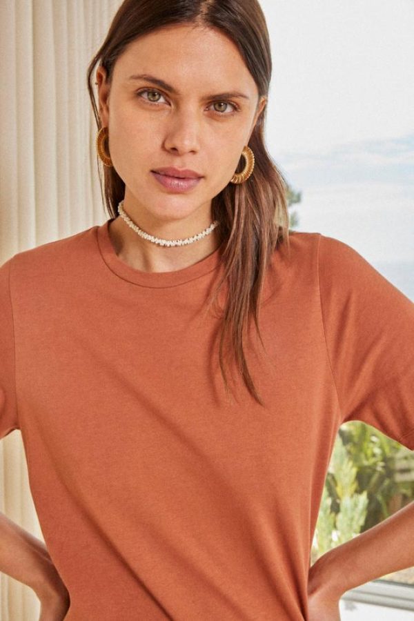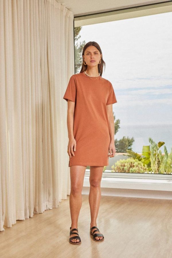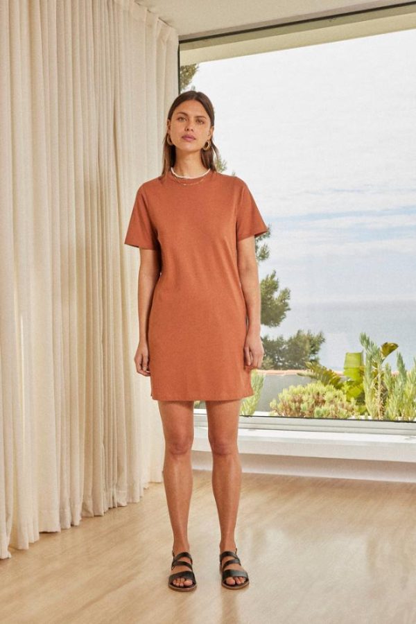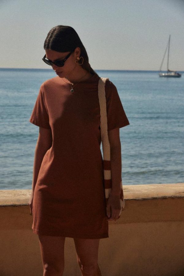 La robe Réjouissance caramel a une coupe simple et moderne. Elle se porte au travail comme à la plage.