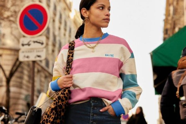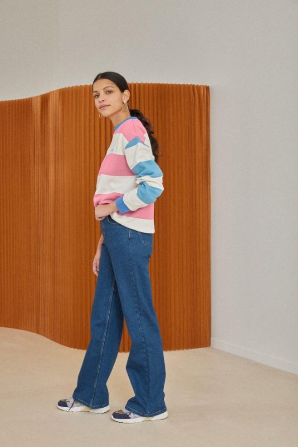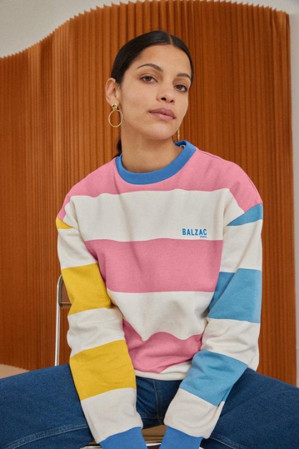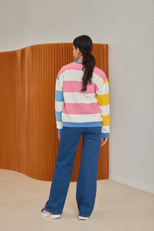 Le charmant sweat-shirt Harlow rayé rose, jaune, écru vous garantit confort et douceur pour les soirées plus fraîches.