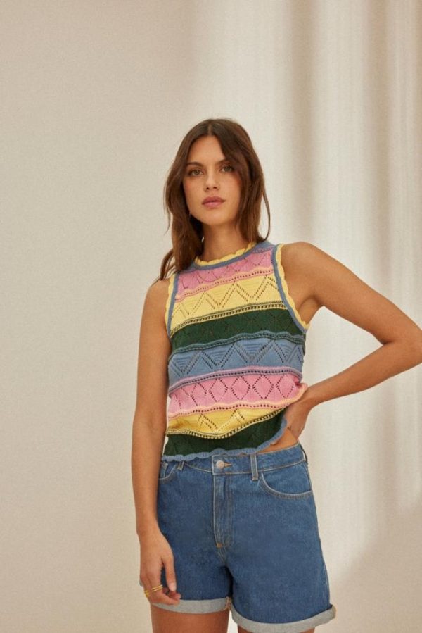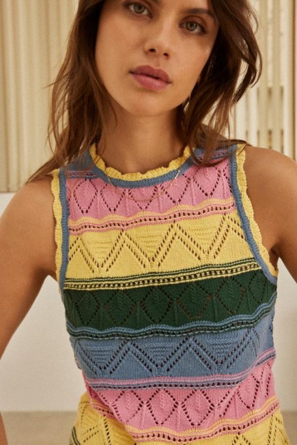 Le top Pistou multicolore sans manches à rayures vous suivra pour l’arrivée des beaux jours.